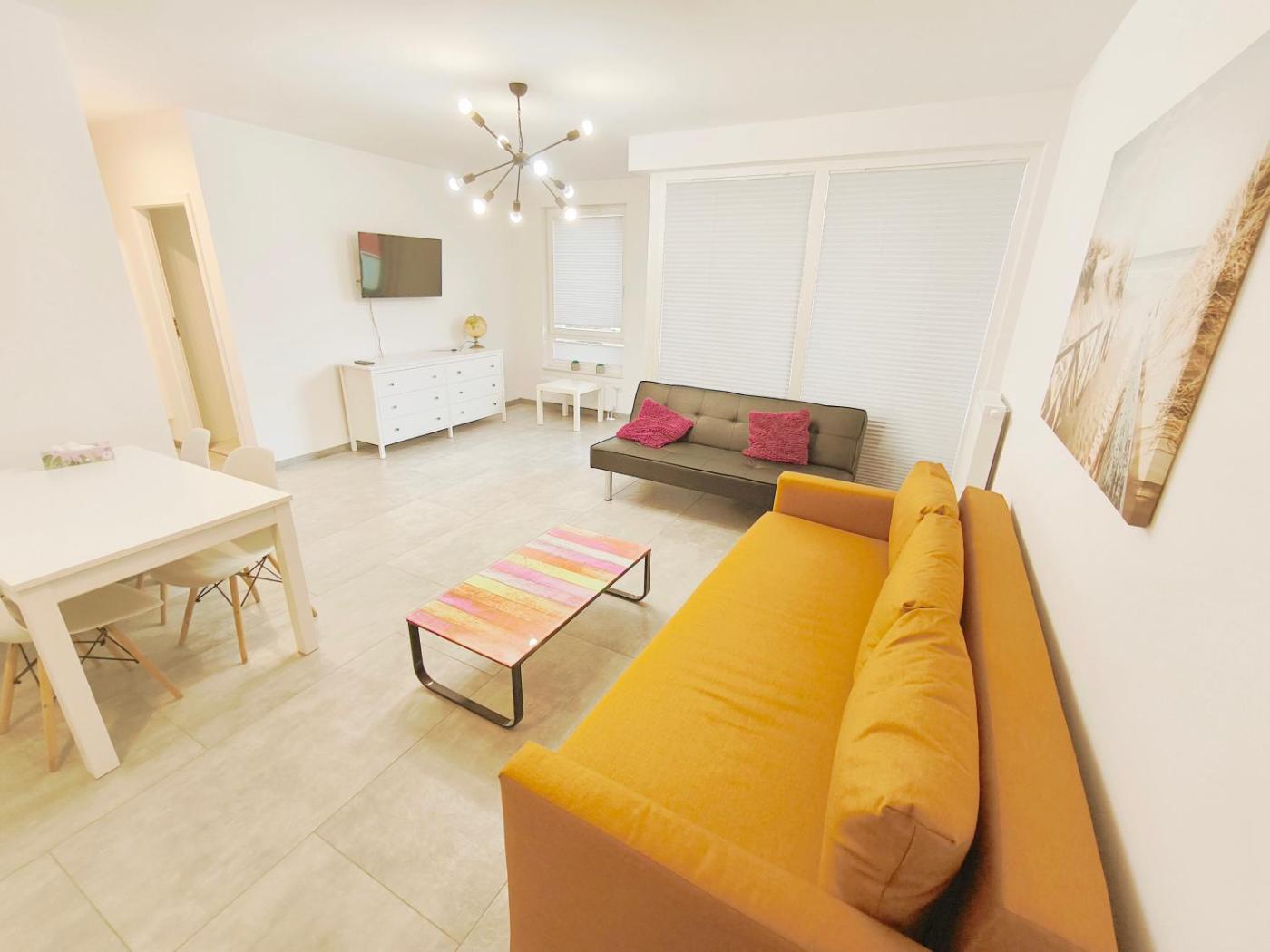 Apartament typu Deluxe z 1 sypialnią. Boasting a private entrance, this apartment includes 1 living room, 1 separate bedroom and 1 bathroom with a shower and a hairdryer. In the fully equipped kitchenette, guests will find a stovetop, a refrigerator, a dishwasher and kitchenware. The apartment offers a washing machine, soundproof walls, a coffee machine, a flat-screen TV, as well as city views. The unit has 3 beds. Apartament - 6 osobowy. Powierzchnia pokoju ok.: 46 mkw.